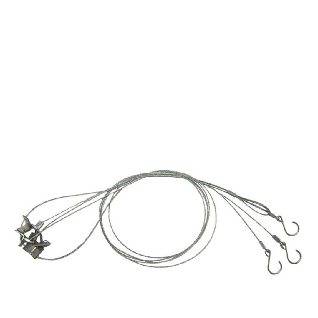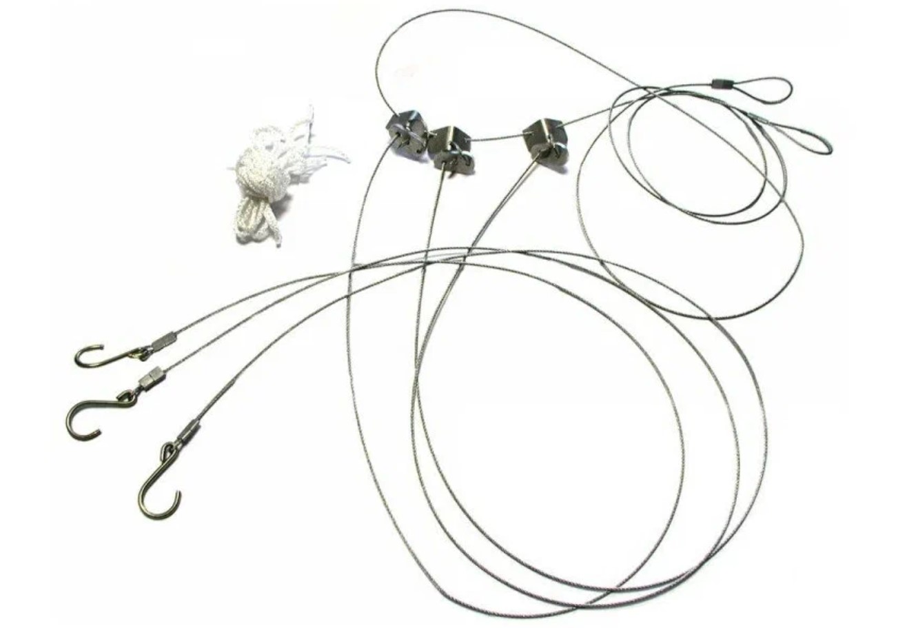 Часть тросика расположенная над костром выполнена из стали, что предотвратит перегорание, а эластичный полиамидный шнур на концах позволит легко привязать трос к деревьям.