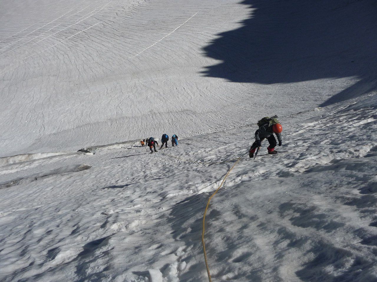 При движении по снегу, в отличие от скал, применяется принцип «двух точек опоры». Этот принцип действителен даже на крутых склонах, когда передвижение совершается способом «в три такта». Только на крутом склоне, покрытом глубоким, рыхлым снегом, где для обеспечения безопасности глубоко в снег запускаются обе руки, соблюдается правило «трех точек опоры». При подъемах и спусках по снежным маршрутам большую нагрузку испытывают мышцы ног. В известной мере из-за сравнительно более быстрого набора высоты, а главным образом, из-за тяжелой работы по изготовлению ступеней, интенсивнее, чем на скальных или ледовых маршрутах, работают сердце и легкие. Последнее особенно важно иметь в виду при проведении тренировок и физической подготовке участников высотных восхождений, в которых преобладают снежные маршруты.